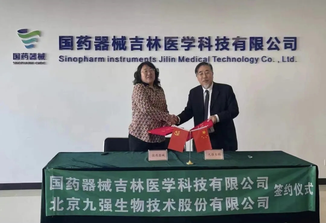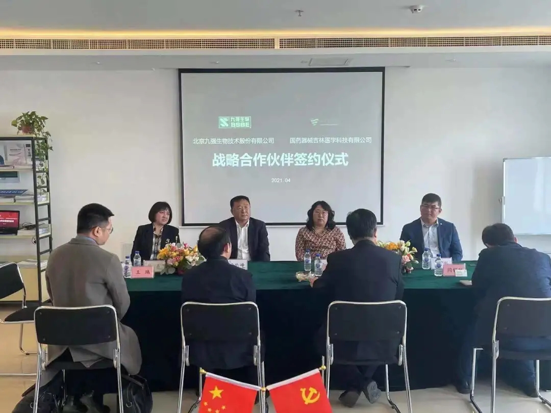 2021年4月21日,B体育(中国)一站式服务平台与国药器械吉林医学科技有限公司就九强在吉林省四平市国药端销售事宜签订了战略合作协议,协议中明确了合作原则和目的,确定了销售方式及供货价格等。参会人员有:国药器械吉林医学科技有限公司副董事长徐险峰、总经理徐春梅、常务副总经理韩立彬、商务经理鲍鑫,B体育(中国)一站式服务平台董事长邹左军、副总周明、东北大区总监闫铭锐、吉林省区总监王禹。