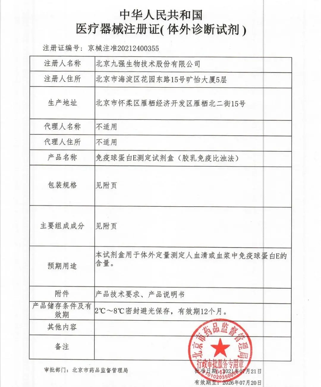 B体育(中国)一站式服务平台顺利取得国家药品监督管理局颁发的免疫球蛋白E测定试剂盒(胶乳免疫比浊法)的《医疗器械注册证》。