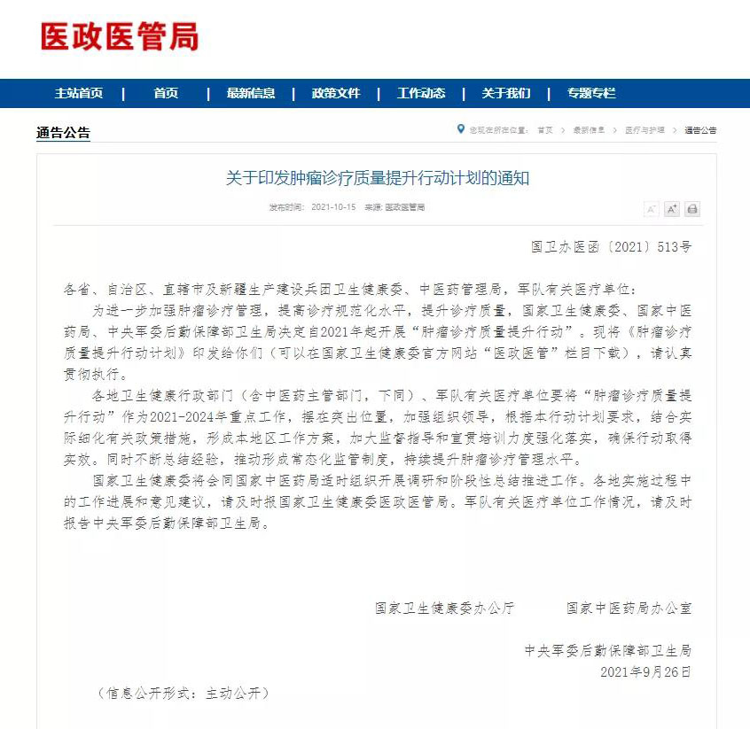 10月15日,国家卫健委发布《关于印发肿瘤诊疗质量提升行动计划的通知》,进一步提升肿瘤诊疗质量水平,规范诊疗行为,保障医疗质量安全。