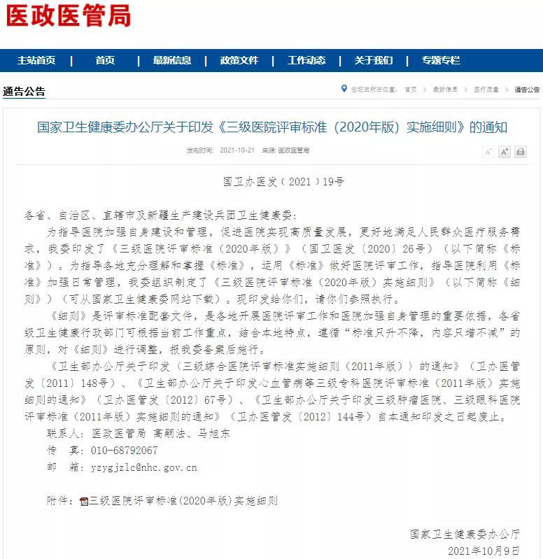 10月21日,国家卫生健康委办公厅发布关于印发《三级医院评审标准(2020年版)实施细则》的通知:
