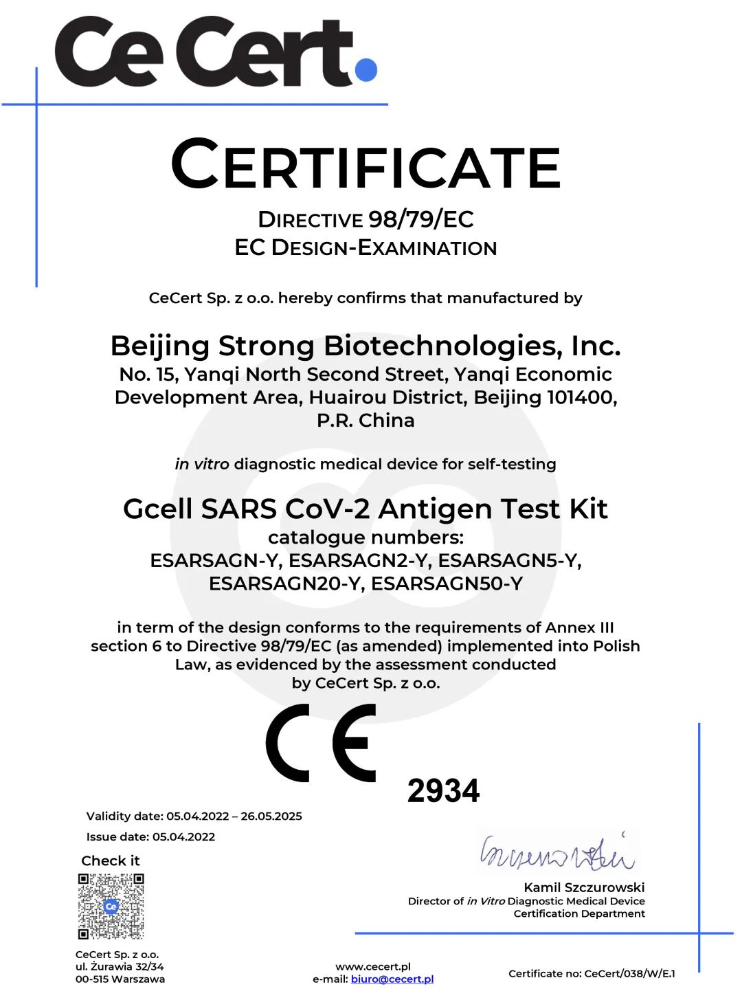 B体育(中国)一站式服务平台新型冠状病毒抗原自测试剂盒(SARS CoV-2 Antigen Test Kit)于2022年4月5日取得欧盟CE准入资格!这意味着该自测试剂盒可在欧盟国家以及认可欧盟CE认证的国家进行销售。