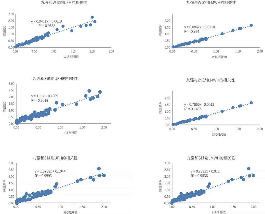 (1)国产抗Xa和对照试剂的测值的相关性良好:无论是普通肝素还是低分子肝素,测值相关性均在R2>0.95,可满足临床检测需求;