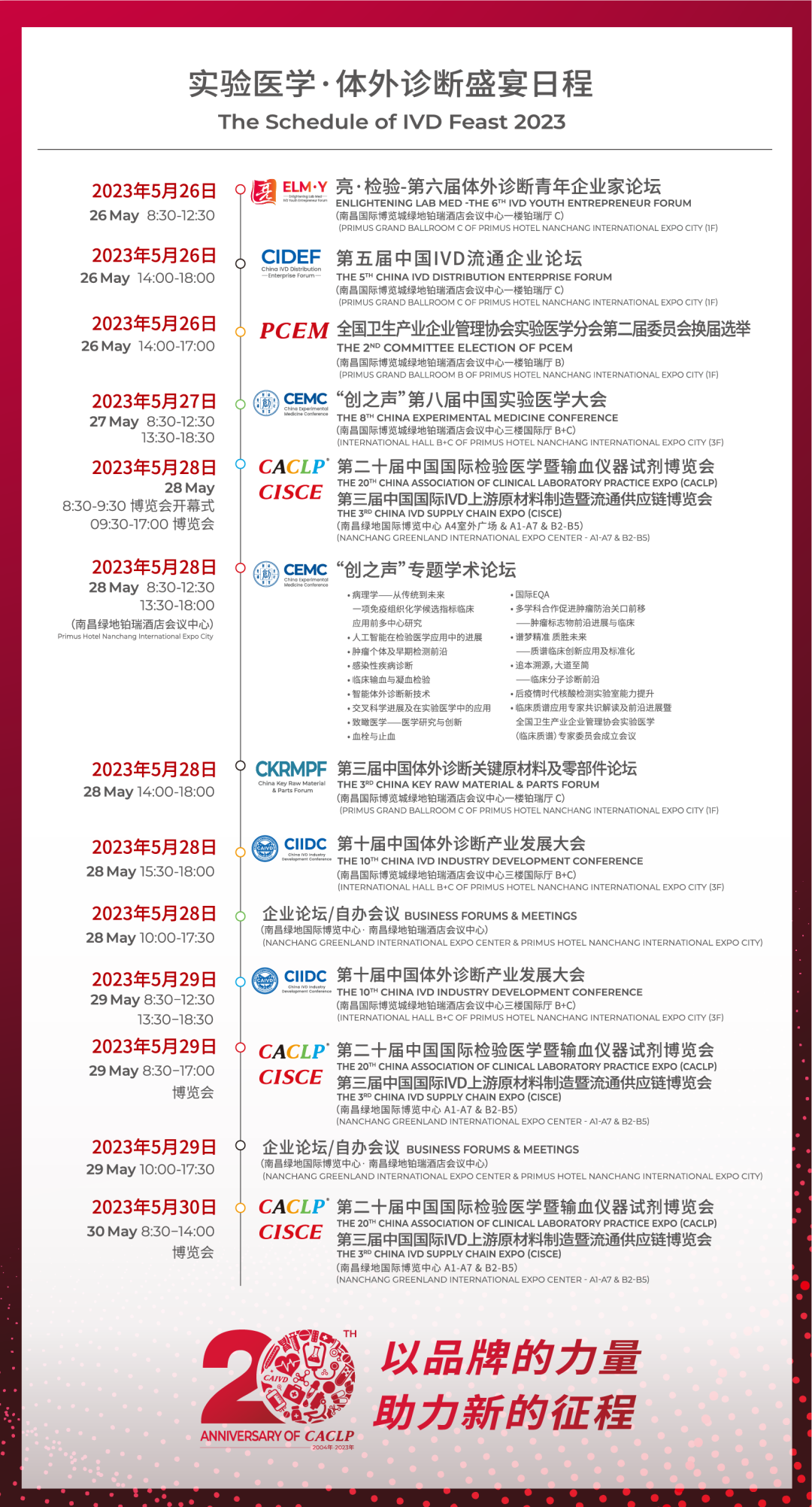 第二十届中国国际检验医学暨输血仪器试剂博览会(CACLP),第三届中国国际IVD上游原材料制造暨流通供应链博览会(CISCE)将于2023年5月28日-30日在南昌绿地国际博览中心举行。