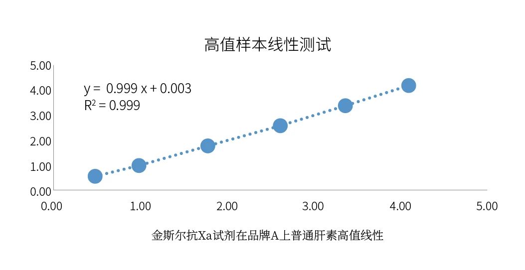 金斯尔抗Xa试剂盒普通肝素线性可以做到4IU/mL,不仅可以满足说明书所宣称的1.2IU/mL,同时可以满足临床上的一些异常特殊高值样本的检测需求。