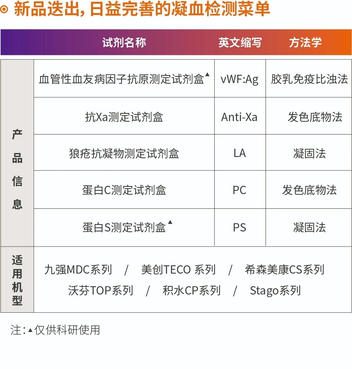 抗Xa活性试验可用于UFH、LMWH、磺达肝癸钠、直接FXa抑制剂等多种药物抗凝强度/血药浓度的测定。