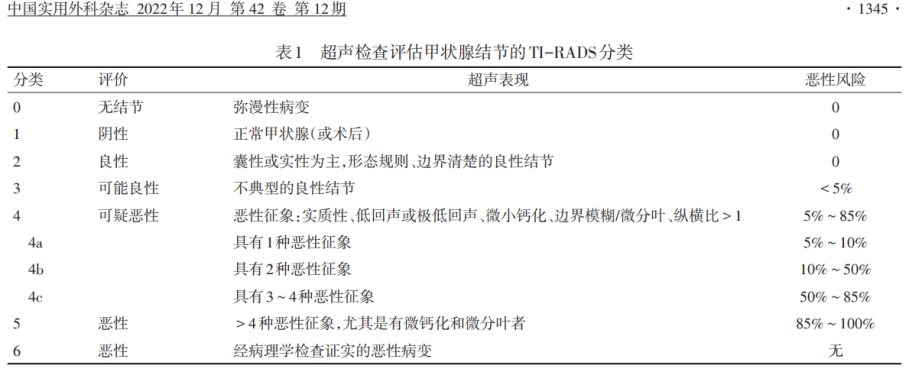 TI-RADS(Thyroid imaging reporting and data system)即甲状腺影像报告和数据系统。依据五个甲状腺结节恶性特征进行分级:①实性结节;②低回声或极低回声;分叶或边缘不规则;④砂砾样钙化;⑤纵横比≥1。
