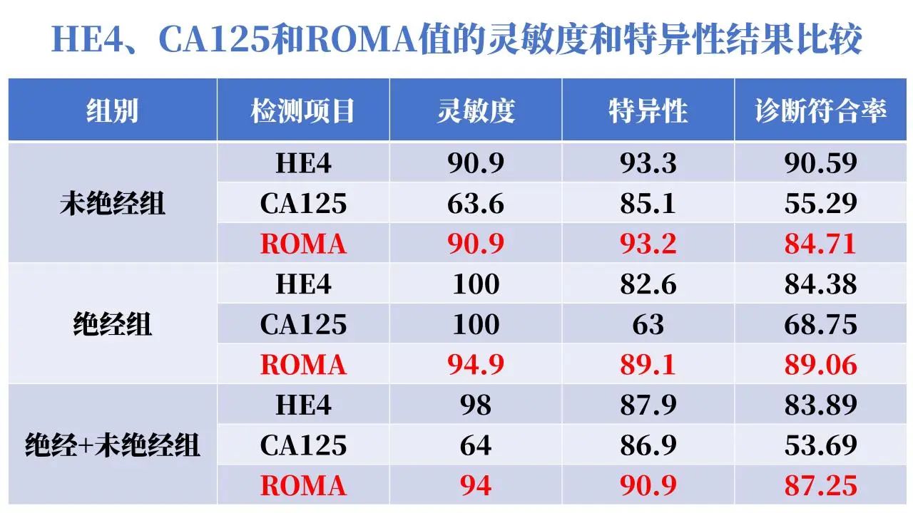 ROMA(卵巢恶性肿瘤风险判定):辅助评估盆腔肿块患者为卵巢癌的风险系数,CA125和HE4的血清浓度与患者绝经状态相结合的一个评估模型,特别是对于提高早期卵巢癌的检出率更有意义。