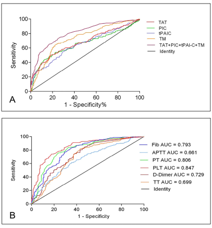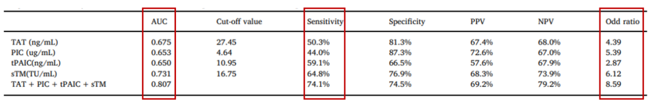一项多中心前瞻性观察研究表明TAT、PIC、tPAIC和sTM在不同基础疾病的DIC患者中表现出良好的诊断性能和预后价值,TAT、tPAIC和sTM在pre-DIC的诊断具有一定的意义。此外,新血栓四项联合检测可增加AUC、灵敏度和优势比,具有更高的检测效能,有助于及时干预。