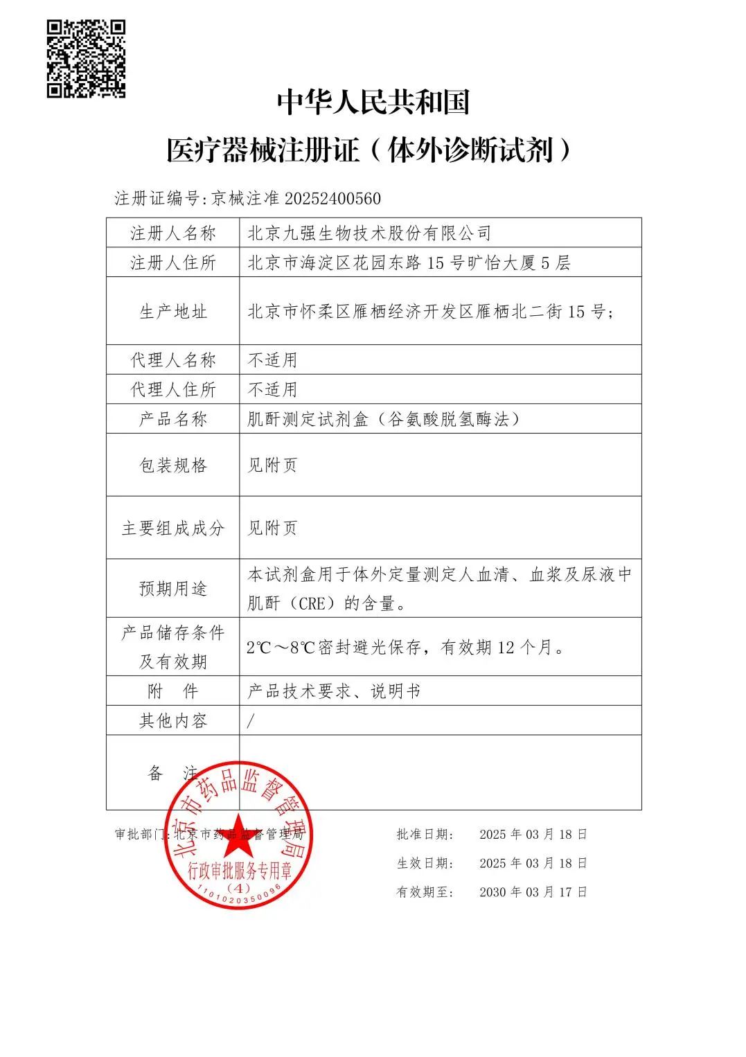 近日,B体育(中国)一站式服务平台肌酐测定试剂盒(谷氨酸脱氢酶法)顺利取得北京市药品监督管理局颁发的《医疗器械注册证》。