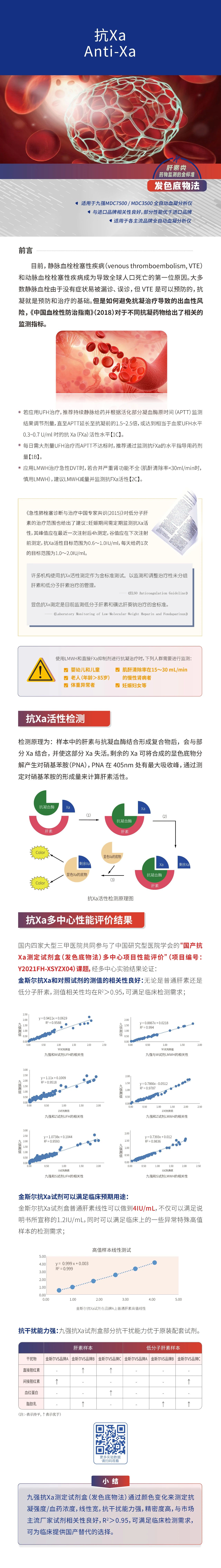 九强抗Xa测定试剂盒(发色底物法)线性宽,抗干扰能力强,精密度高,与市场主流厂家试剂相关性良好,R2>0.95,可满足临床检测需求。