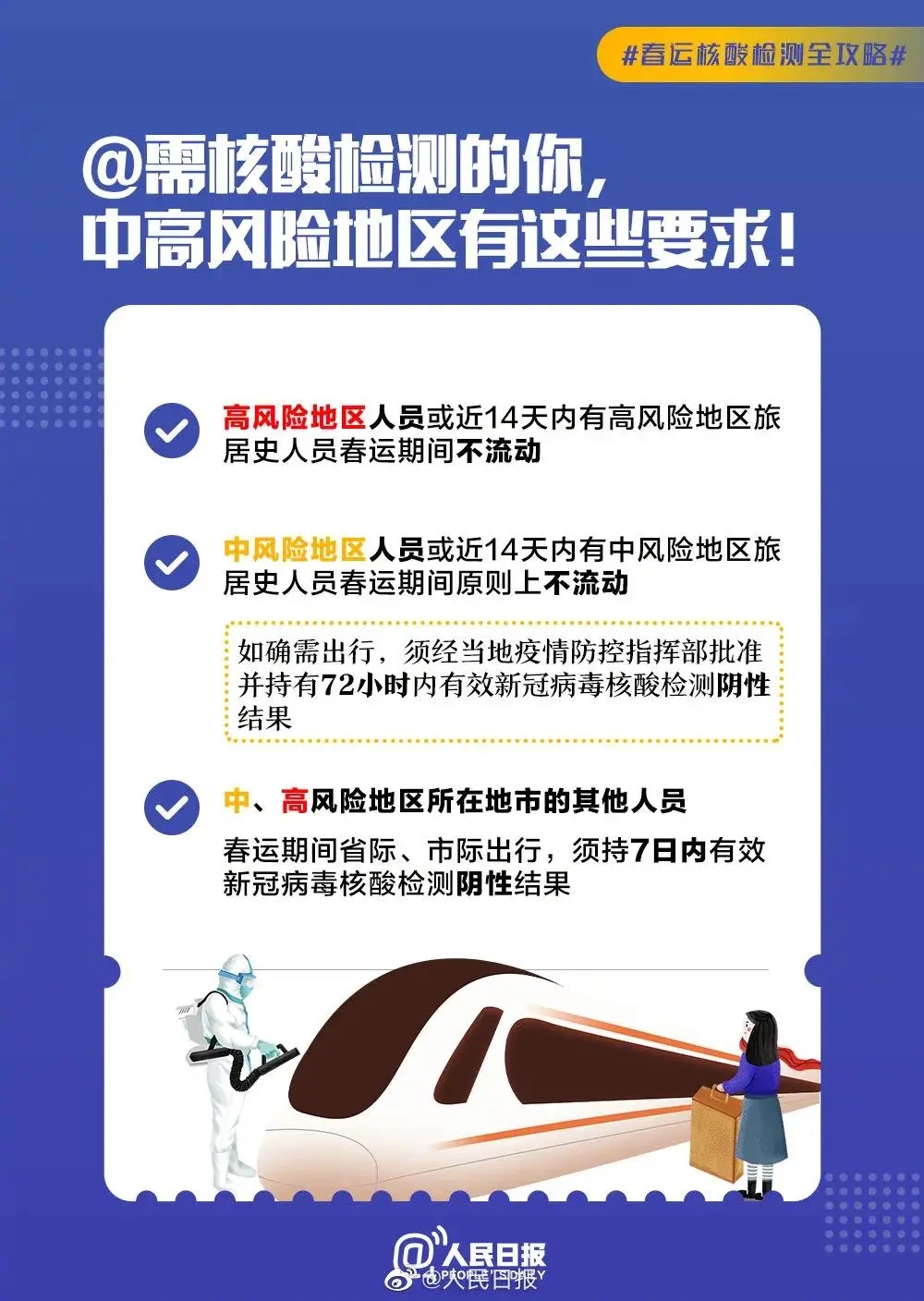 今天是2021春运第1天。高中低风险地区有哪些具体要求?什么情况需要做核酸检测?如何预约?核酸检测必知注意事项有哪些?**要求↓↓有用,扩散周知!