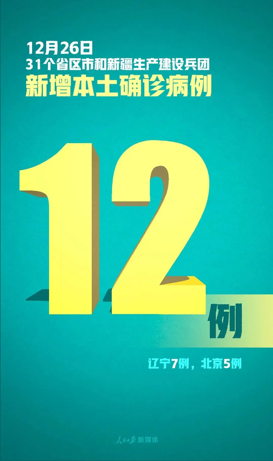 12月26日0—24时,31个省(自治区、直辖市)和新疆生产建设兵团报告新增确诊病例22例,其中境外输入病例10例(上海4例,北京3例,浙江2例,安徽1例),本土病例12例(辽宁7例,北京5例);无新增死亡病例;无新增疑似病例。